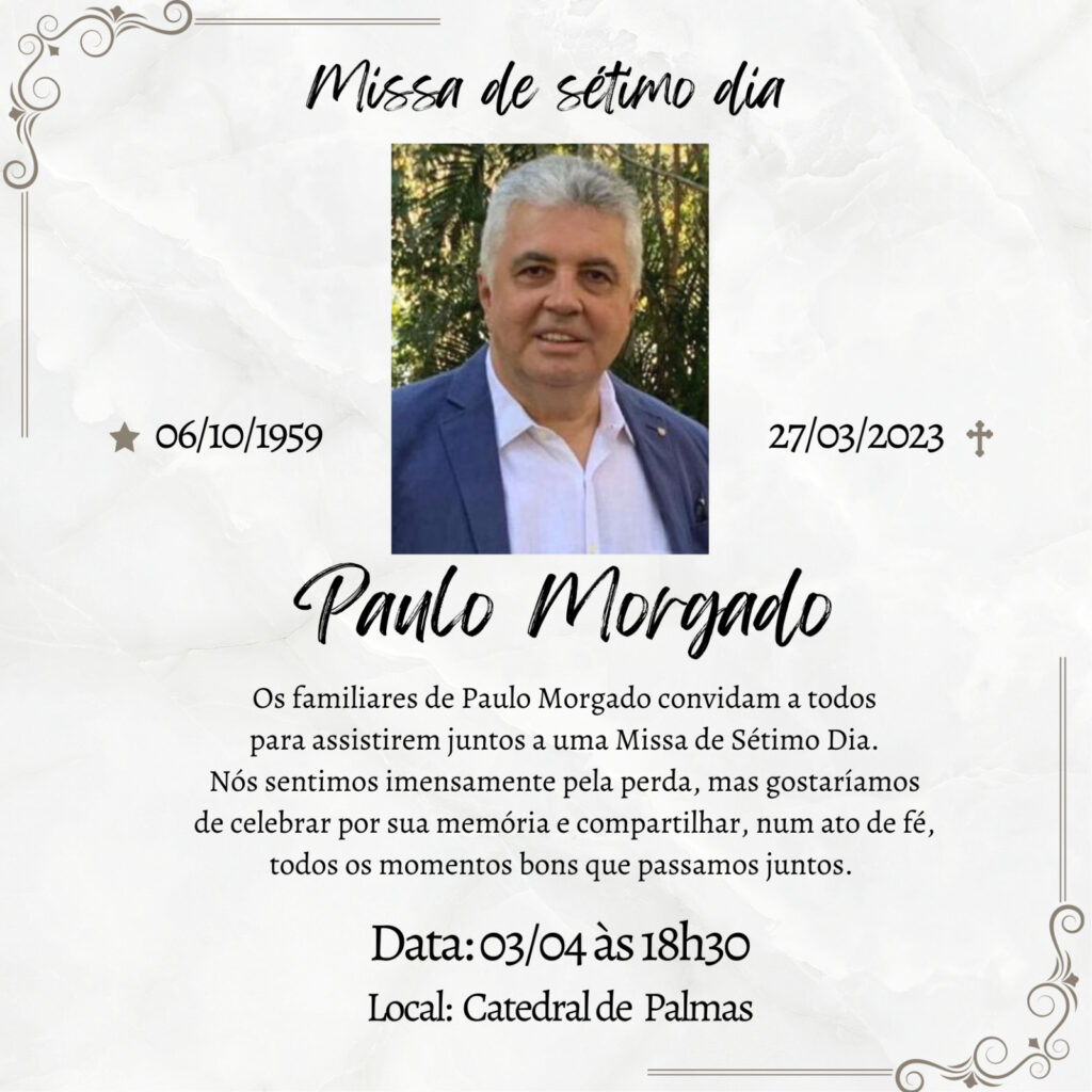 Nesta segunda-feira, 3 de abril, às 18h30, será realizado na Catedral de Palmas, a Missa de Sétimo Dia em homenagem a Paulo Renato Gemellaro Morgado, servidor aposentado do Tribunal de Contas do Tocantins (TCE/TO).