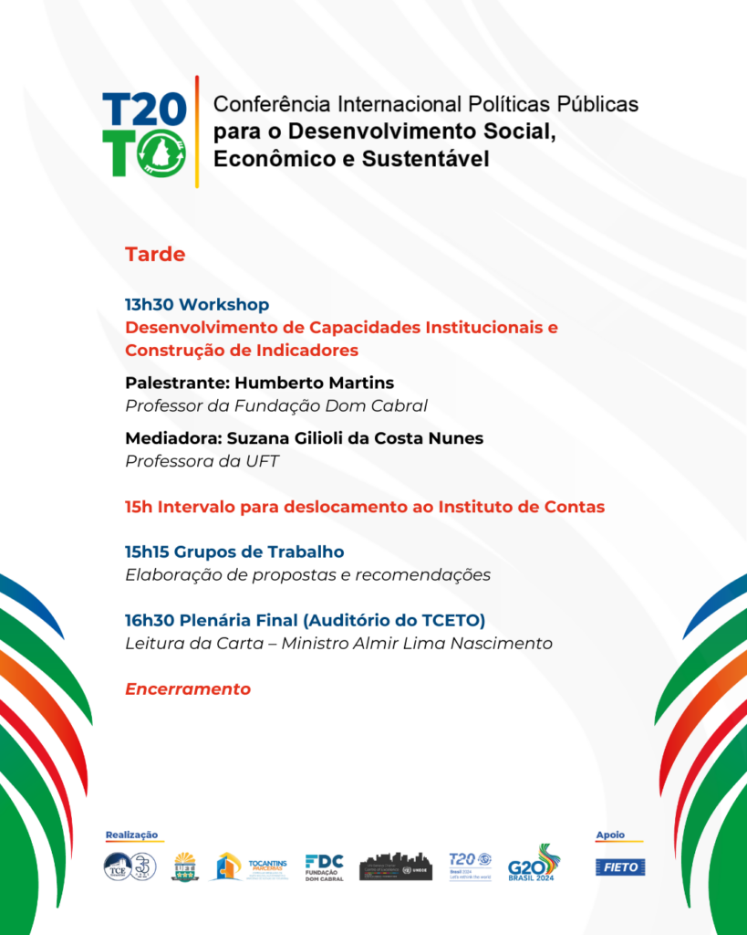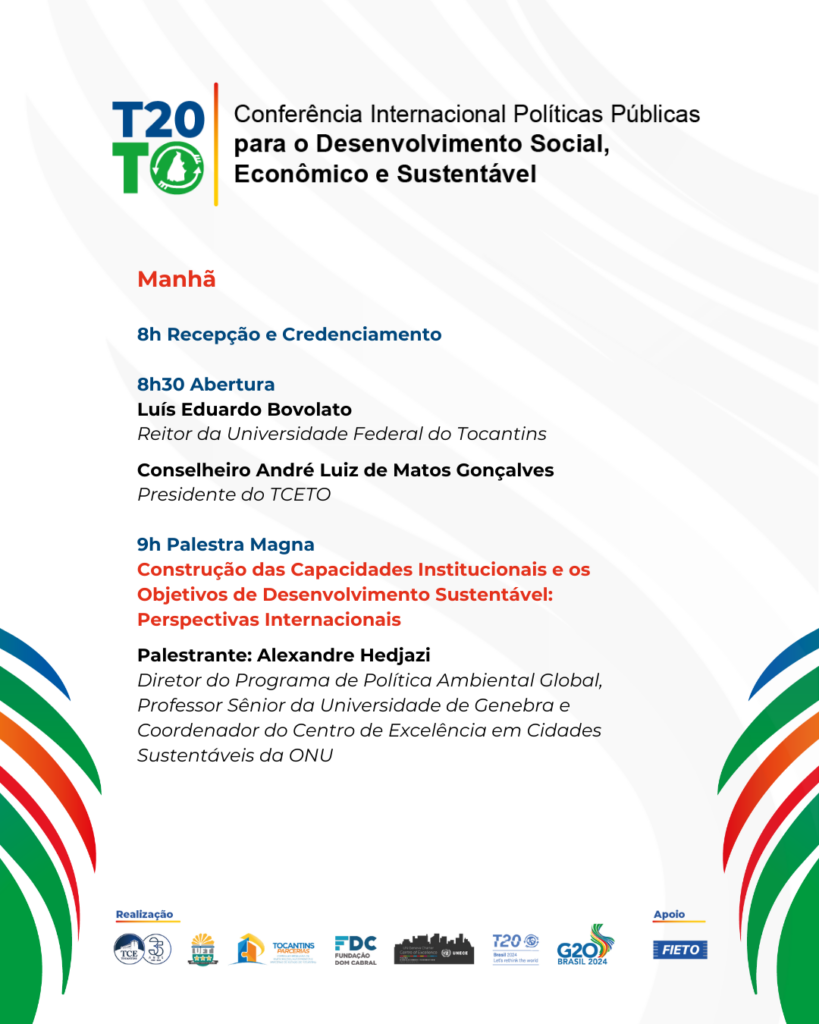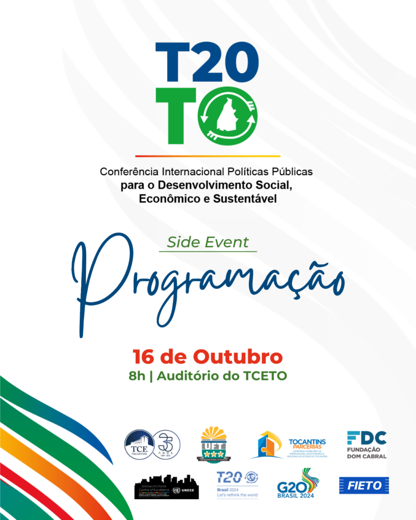 A Conferência Internacional “Políticas Públicas para o Desenvolvimento Social, Econômico e Sustentável”, o T20, acontece nesta quarta-feira, 16 de outubro, a partir das 8h da manhã, no auditório do Tribunal de Contas do Estado do Tocantins (TCETO), em Palmas. O evento é uma realização em parceria entre a Corte e a Universidade Federal do Tocantins (UFT). A conferência faz parte da agenda do T20 e ocorre em um momento de extrema importância, em que o mundo enfrenta desafios globais, como as mudanças climáticas e suas consequências, como a desigualdade social e a instabilidade econômica.