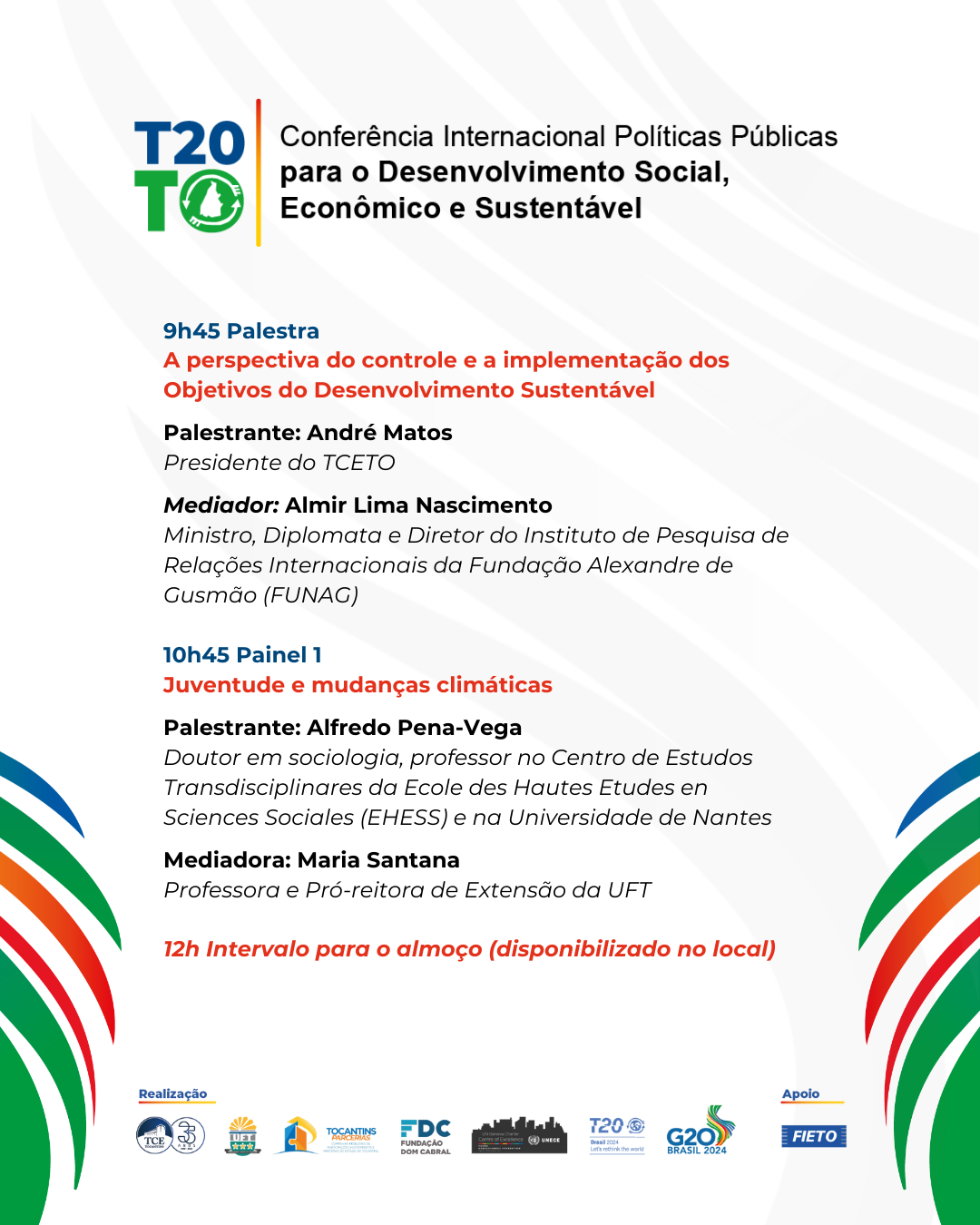A Conferência Internacional “Políticas Públicas para o Desenvolvimento Social, Econômico e Sustentável”, o T20, acontece nesta quarta-feira, 16 de outubro, a partir das 8h da manhã, no auditório do Tribunal de Contas do Estado do Tocantins (TCETO), em Palmas. O evento é uma realização em parceria entre a Corte e a Universidade Federal do Tocantins (UFT). A conferência faz parte da agenda do T20 e ocorre em um momento de extrema importância, em que o mundo enfrenta desafios globais, como as mudanças climáticas e suas consequências, como a desigualdade social e a instabilidade econômica.