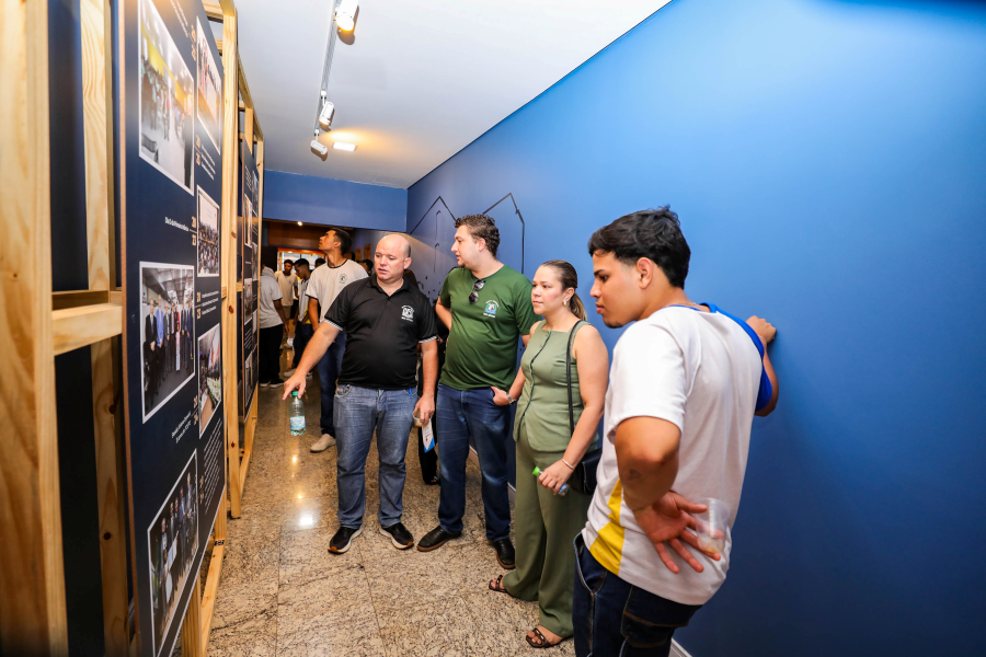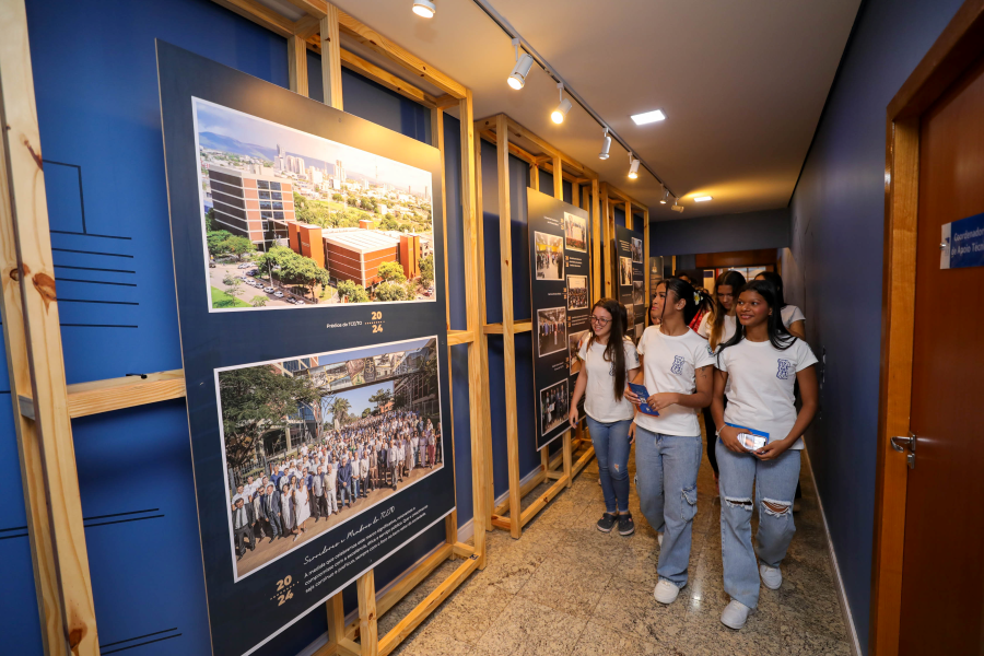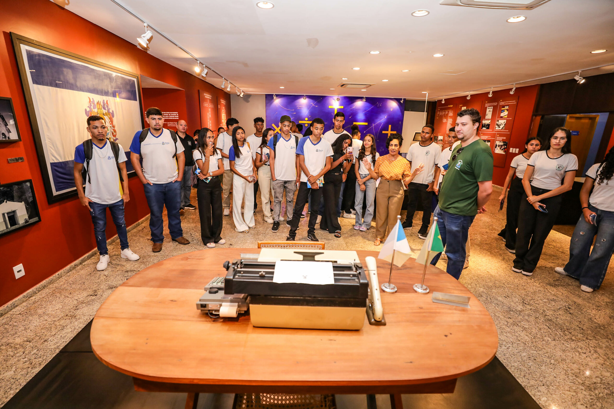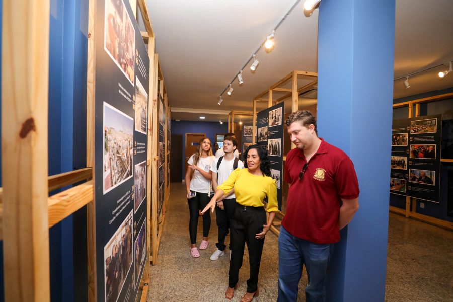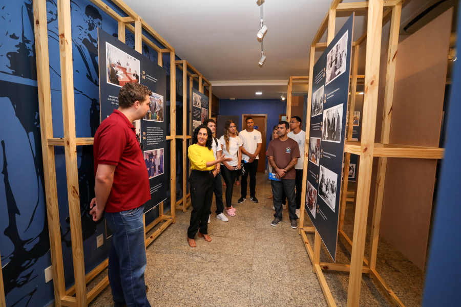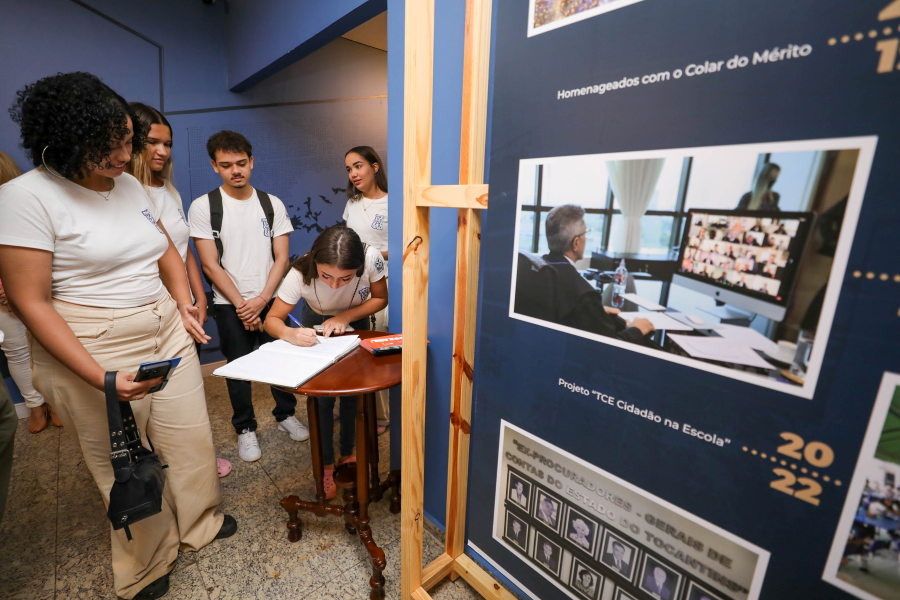 A servidora Claudete Ferreira também conduziu os alunos pela exposição fotográfica alusiva aos 35 anos do Tribunal de Contas, proporcionando uma imersão na trajetória da instituição.