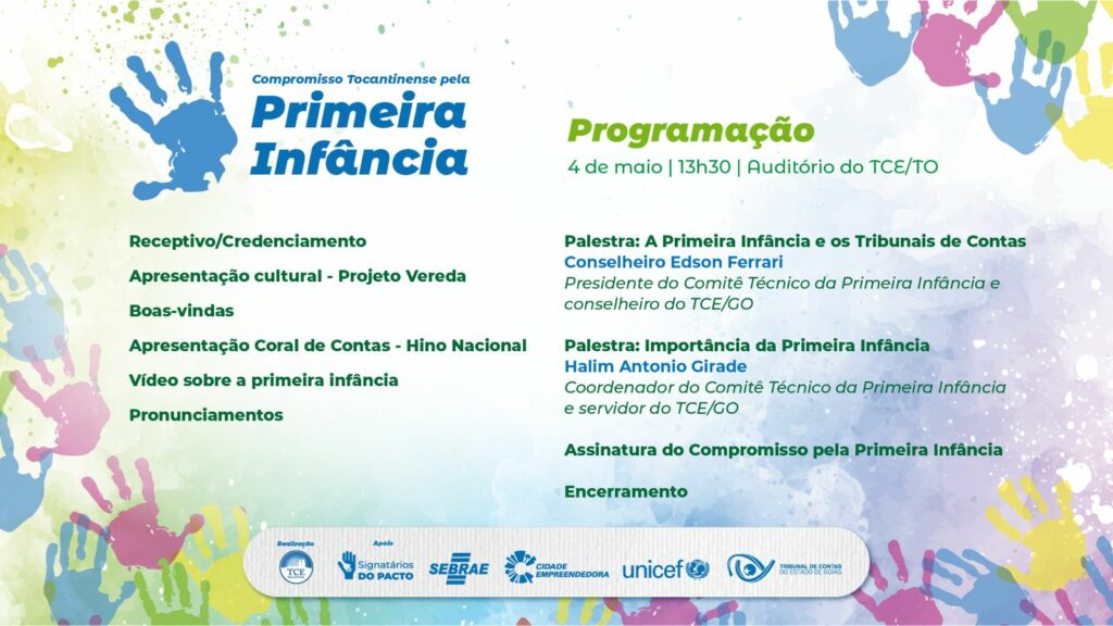Será nesta quinta-feira, 4 de maio, a partir das 13h30, no auditório do Tribunal de Contas do Estado do Tocantins (TCE/TO), o evento para assinatura, entre a Corte e gestores públicos, do Compromisso Tocantinense pela Primeira Infância. A ação do TCE/TO visa mobilizar a administração pública em prol de investimentos que resultem em serviços para garantir qualidade de vida às crianças tocantinenses incorporadas à Saúde, Educação, Saneamento Básico, Segurança e Alimentação.