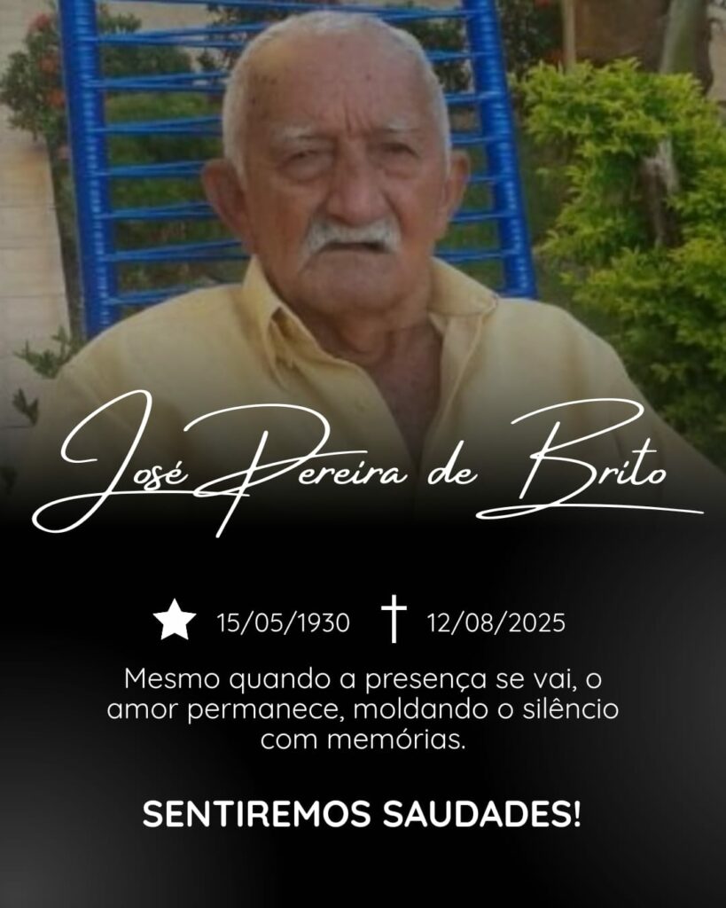 José Pereira de Brito, faleceu aos 95 anos nesta terça-feira, 12 de agosto, em Carolina, no Maranhão. O velório acontece na Avenida Brasília, n⁰ 202 e, o sepultamento às 17h, no Cemitério Parque Girassol, ambos em Carolina.