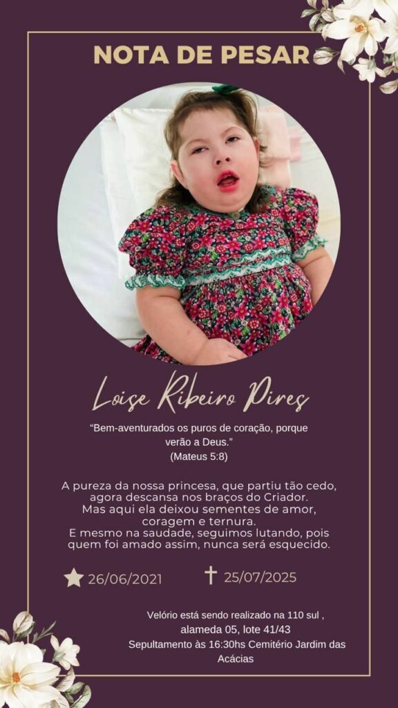 O Tribunal de Contas do Estado do Tocantins (TCETO), por meio de seus membros e servidores, manifesta profundo pesar pelo falecimento da pequena Loise Ribeiro Pires, de 4 anos.