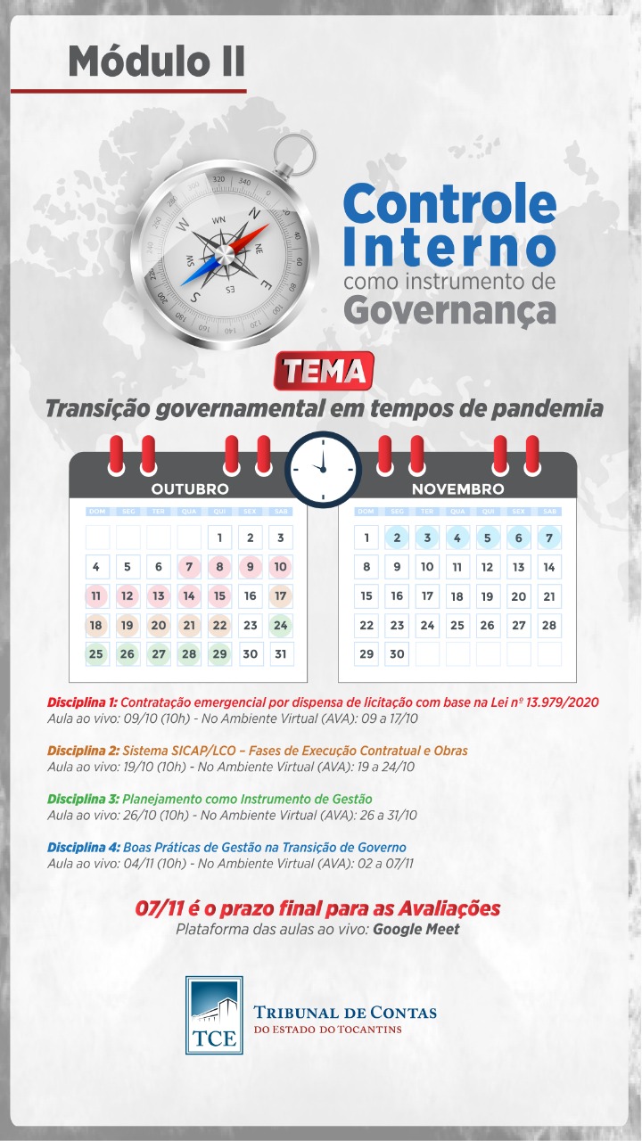 O tema geral desse segundo módulo é o “Controle Interno como ferramenta de transição governamental em tempos de pandemia” e teve no dia 9 de outubro e o encerramento será dia 7 de novembro. O projeto é realizado em ambiente virtual de aprendizagem (EaD), com algumas aulas ao vivo e disponibilizado pelo Instituto de Contas 5 de Outubro, do TCE/TO. O público-alvo é composto por servidores públicos responsáveis pelo setor, tanto nas prefeituras, quanto nas câmaras municipais de todas as cidades tocantinenses.
