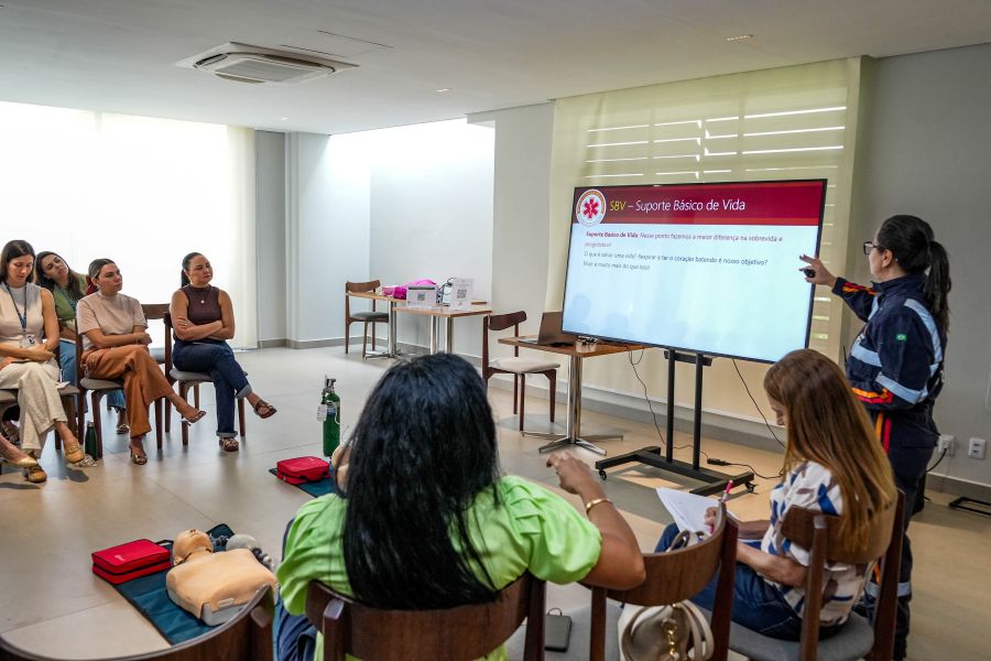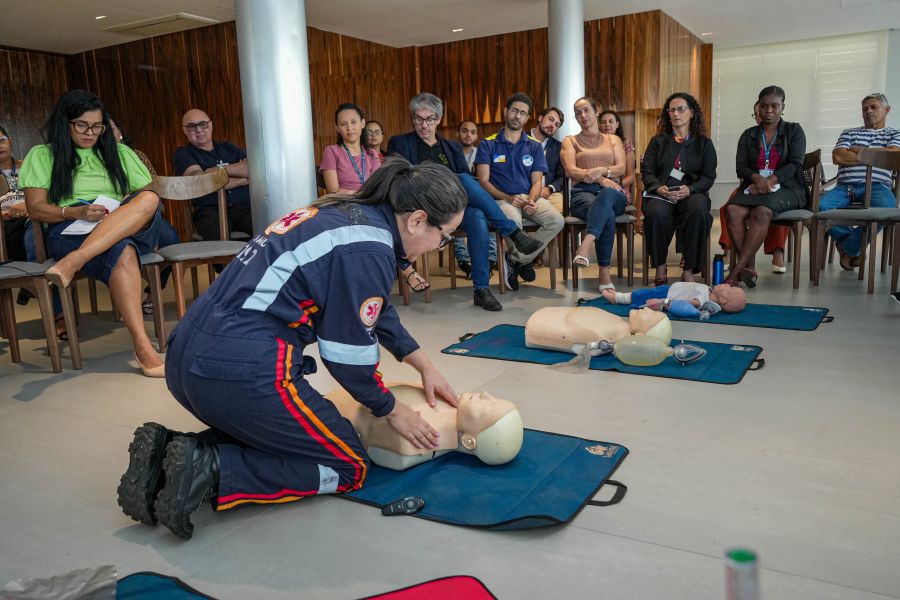 Durante o curso, os participantes aprenderam acionar o socorro corretamente, executar técnicas de reanimação cardiopulmonar (RCP), que consistem em 30 compressões torácicas seguidas de duas ventilações, além do uso do desfibrilador externo automático (DEA) e manobras de desengasgo em crianças.
