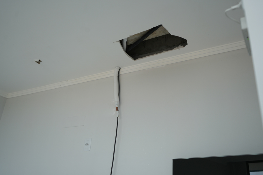 O relatório técnico apontou vícios construtivos e falhas de acabamento na edificação, como infiltrações, fissuras em paredes e pisos, problemas no forro de gesso, falhas no sistema elétrico, ausência de vedação adequada no telhado e problemas em esquadrias e guarda-corpos. Também foram identificadas inconformidades no sistema de drenagem da cobertura, que têm favorecido infiltrações em vários ambientes do prédio.