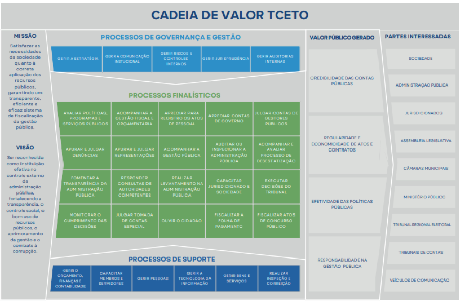O Tribunal de Contas do Estado do Tocantins (TCETO) deu um importante passo para modernizar sua gestão e melhorar o atendimento ao público ao aprovar, por meio da Portaria 53/2025, a Cadeia de Valor. Essa ferramenta estratégica mapeia e analisa os processos internos da instituição, destacando as etapas que geram maior impacto e benefício para a sociedade, em sintonia com o conceito de valor público.