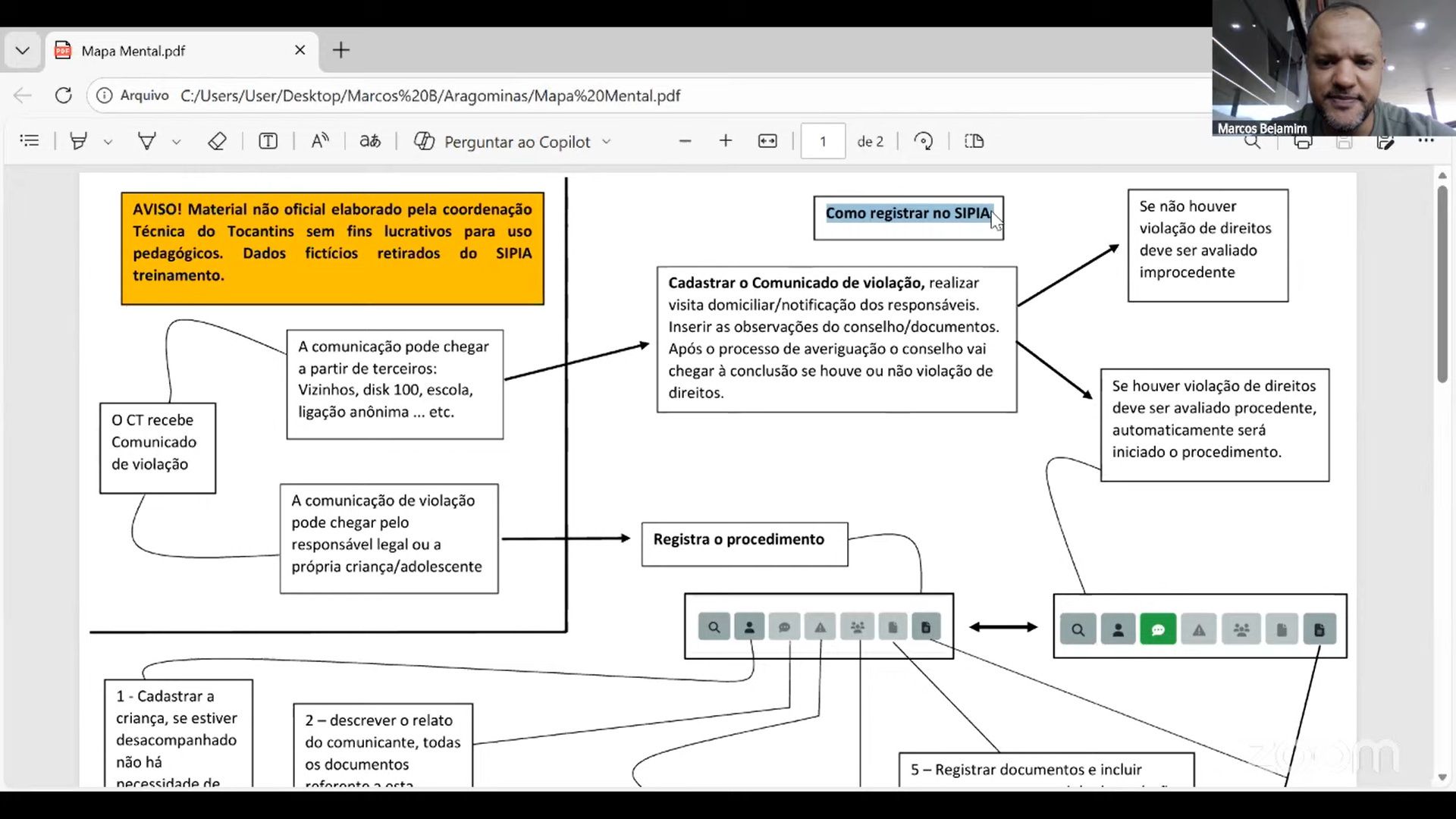 No terceiro e último dia, Marcos Benjamin apresentou um mapa mental, reforçando novamente o passo a passo para a correta alimentação do sistema, conforme a comunicação de violação de direitos da criança e do adolescente. Ele explicou que essas comunicações podem ser feitas por vizinhos, pelo Disque 100, pela escola, por ligação anônima, pelo responsável legal ou pela própria vítima. “A partir da comunicação de violação de direitos, o conselheiro deve averiguar a situação e, sendo procedente, o sistema é acionado automaticamente”, explicou.