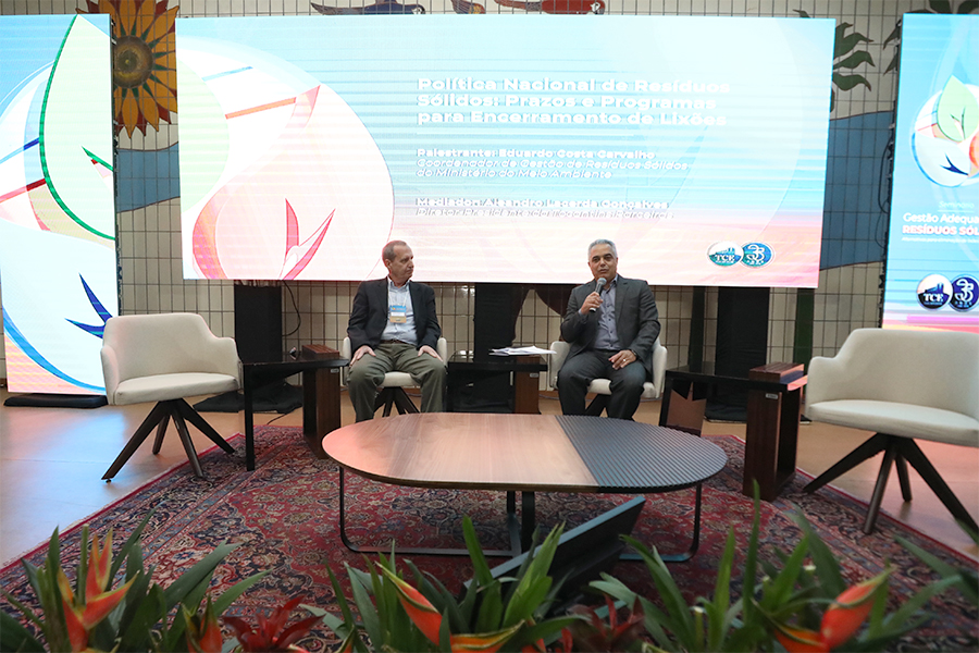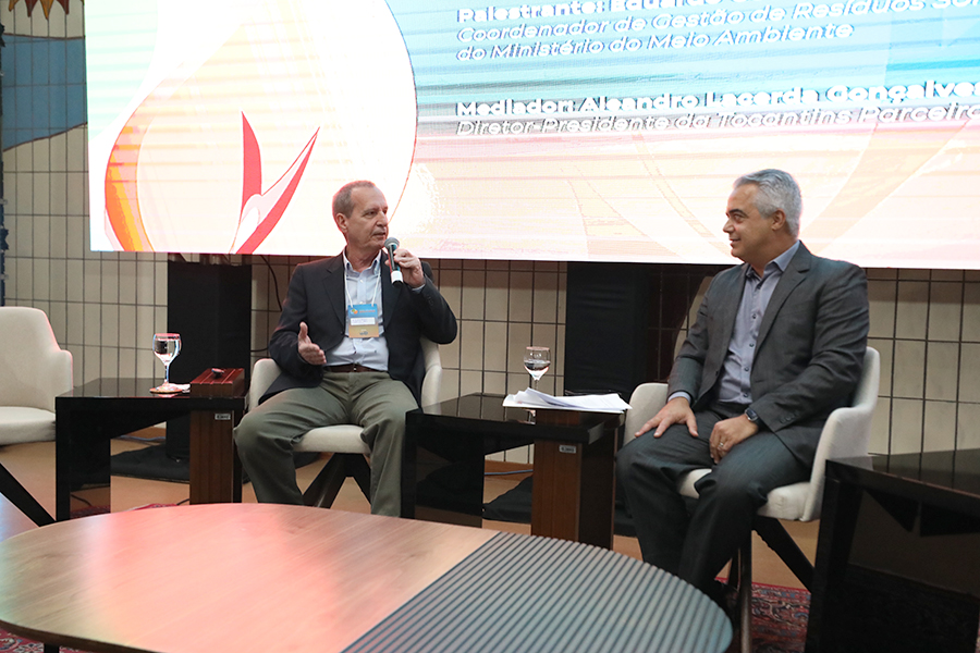 Eduardo Costa Carvalho, coordenador de gestão de resíduos sólidos do Ministério do Meio Ambiente, abordou a “Política Nacional de Resíduos Sólidos: Prazos e Programas para Encerramento de Lixões”, tendo como mediador Aleandro Lacerda Gonçalves, diretor-presidente da Tocantins Parceiras.