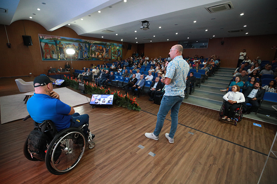 Em seguida, o atleta paraolímpico Reinaldo Charão, que participou das Olimpíadas de Paris, na modalidade Tiro com Arco, contou como treina, apesar da paralisia cerebral que o deixou, aos 17 anos, na cadeira de rodas e quais são as dificuldades que enfrenta, assim como outras pessoas, em situações de acessibilidade e inclusão.